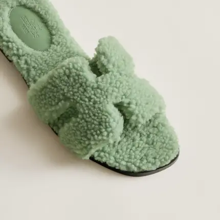 Sandal in shearling with iconic “H” cut-out. A daring yet comfortable style. Black leather sole Black leather heel Sea green
