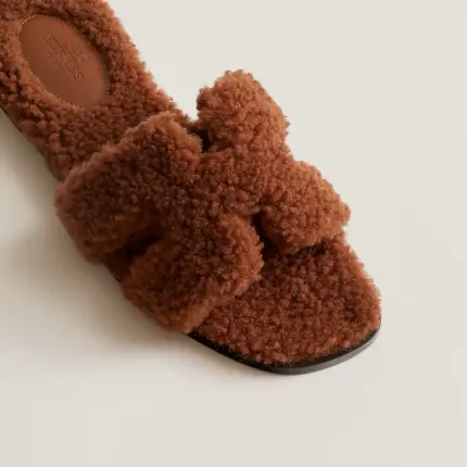 Sandal in shearling with iconic “H” cut-out. A daring yet comfortable style. Black leather sole Black leather heel Brown shearling